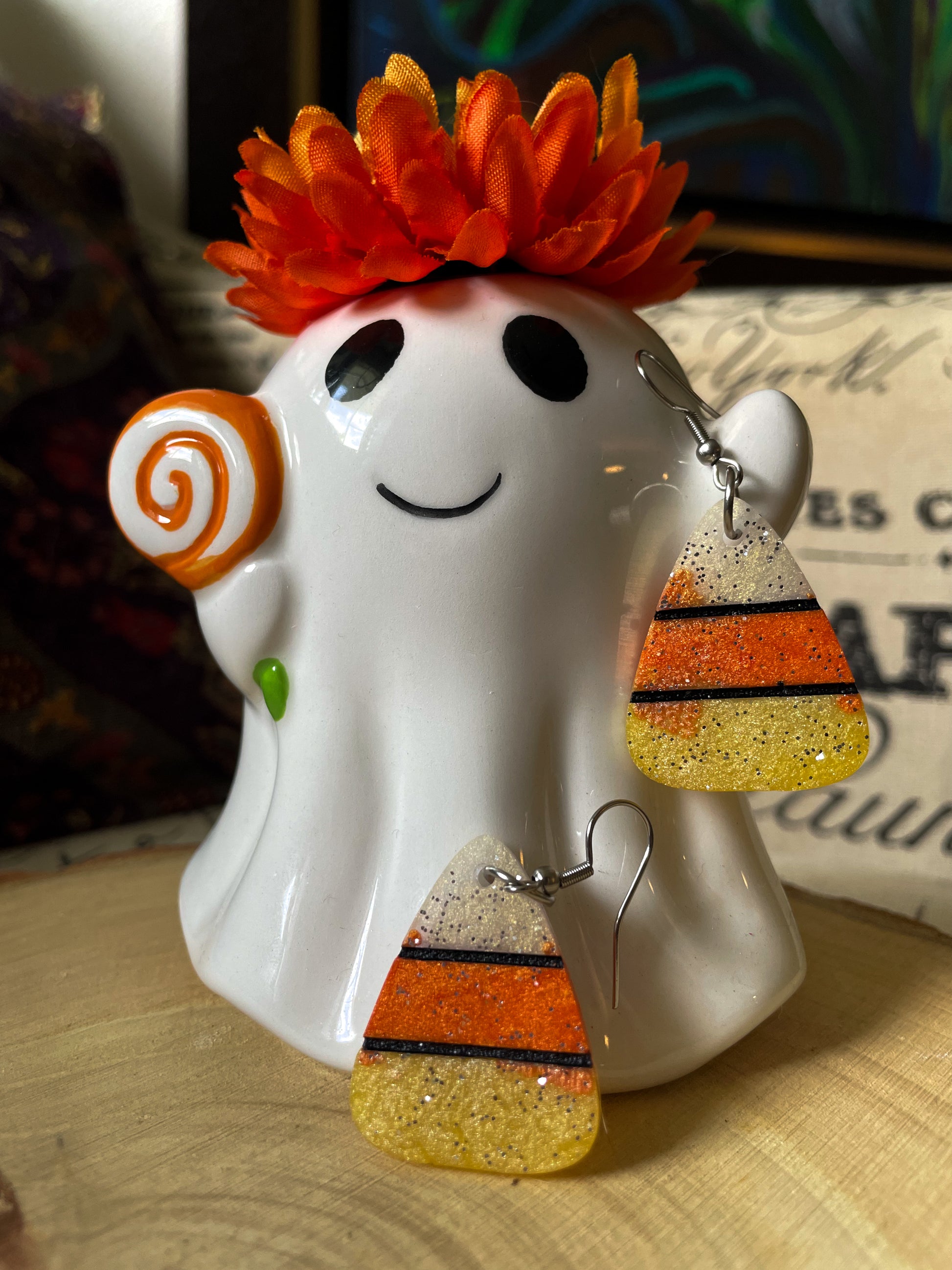 Handmade resin earrings. The hooks are stainless steel. Completely waterproof. If you love Halloween Season and candy corns, these earrings are for you.