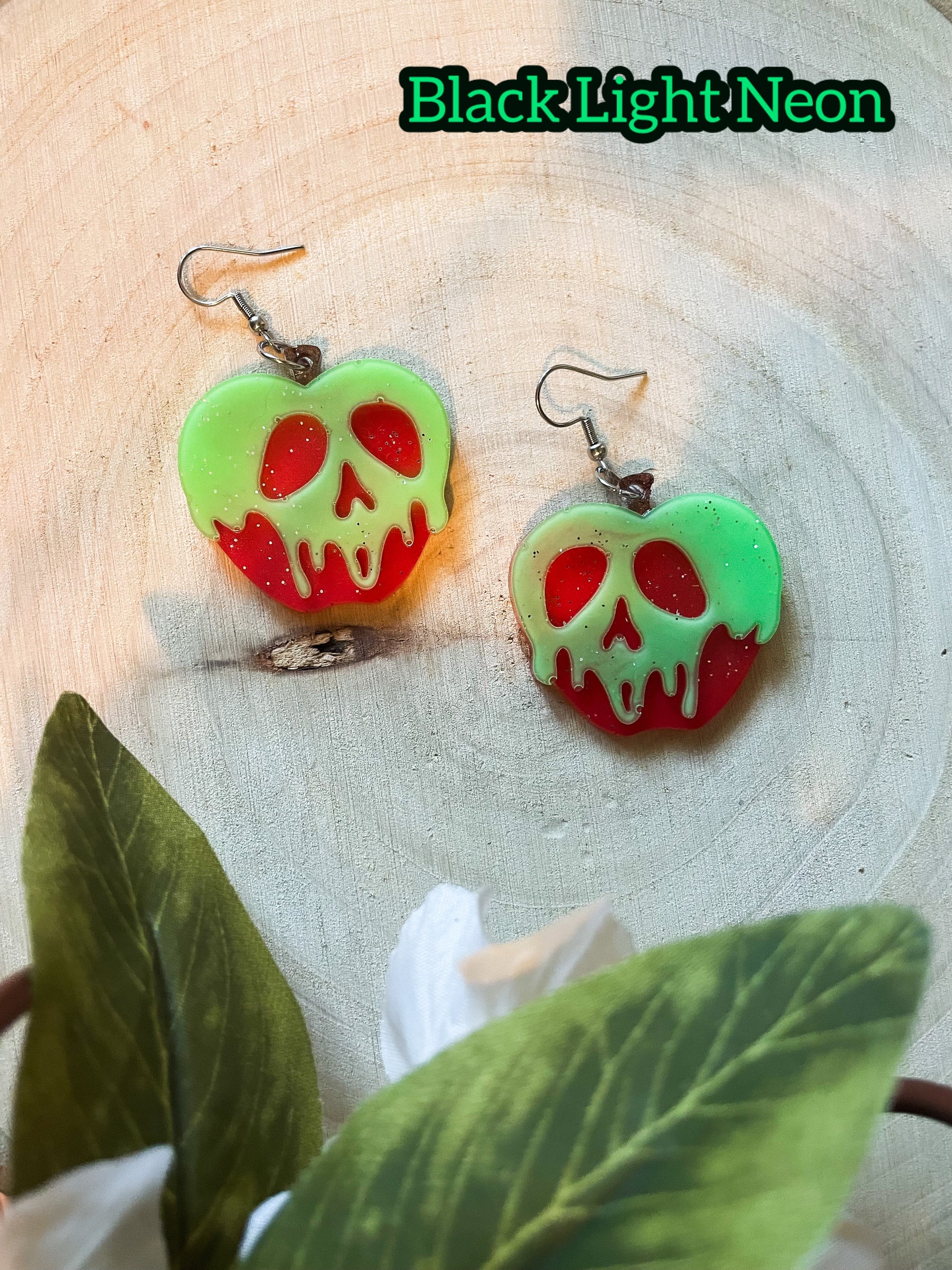 Handmade resin earrings with neon paint, visible with black light. The hooks are stainless steel. Completely waterproof. If you love The Evil Queen, these earrings are perfect for you.