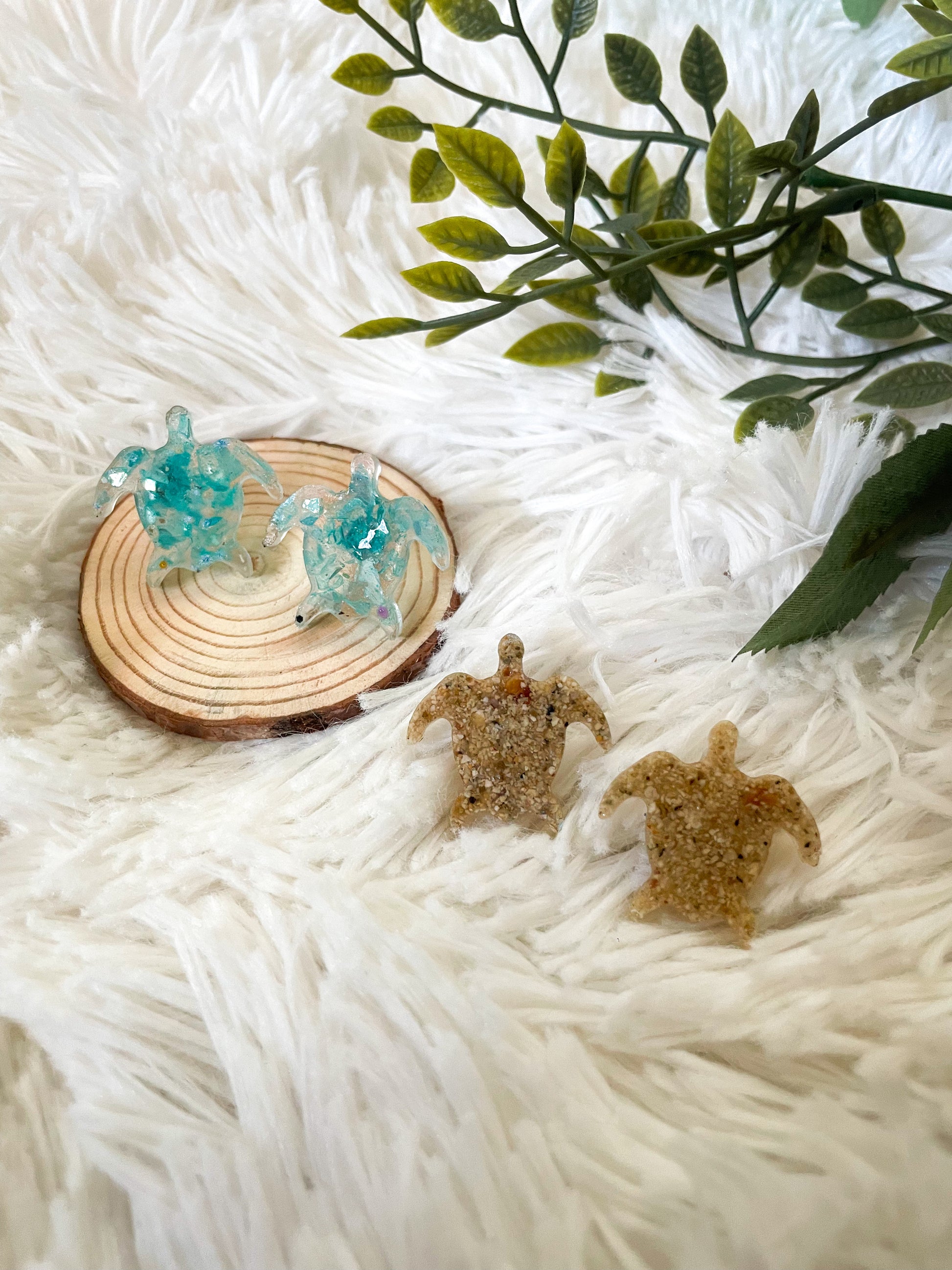 Cute resin turtle studs inspired by the ocean and beach vibes, available in different colors. Featuring real sand from Cabo Rojo and sparkling details, these studs are perfect for turtle lovers who enjoy a touch of coastal charm.šš¢