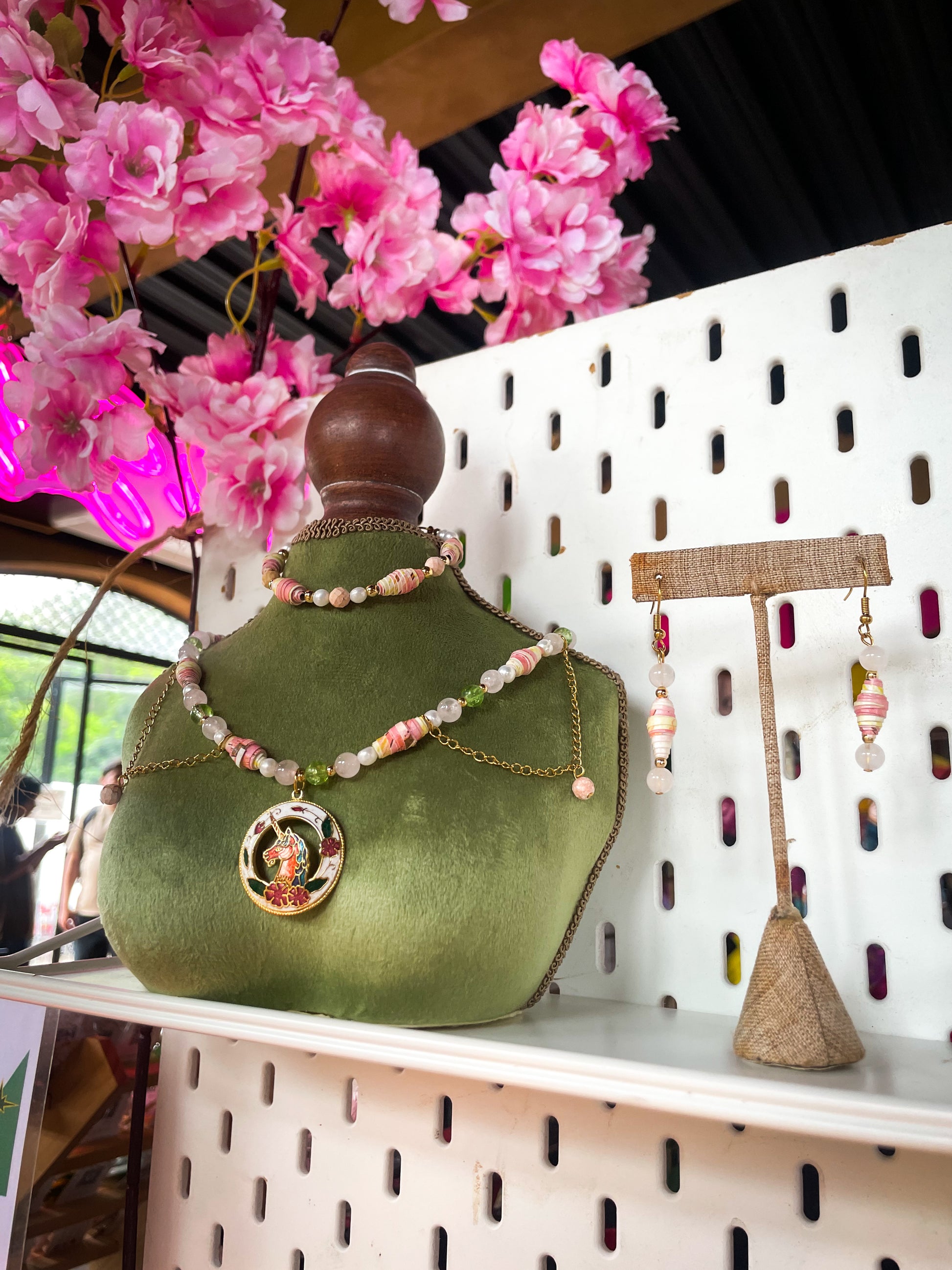 A dreamy, fairy-inspired set (necklace, bracelet and earrings) featuring hand-rolled paper beads, freshwater pearls, and rose quartz, creating a soft and magical balance of textures. Finished with a charming unicorn pendant, this piece celebrates handmade beauty, imagination, and gentle fairy vibes. Perfect for adding a touch of magic to your everyday look.🦄✨🧚♀️